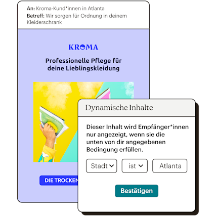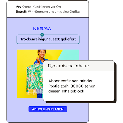 Im E‑Mail-Marketing kannst du durch dynamische Inhalte sicherstellen, dass die richtigen Inhalte die richtigen Personen erreichen und dass jede Nachricht persönlich formuliert ist – auch wenn du viele auf einmal versendest. Dadurch musst du keine separate E‑Mail erstellen oder eine Folgemail versenden, wenn du einige Inhalte nur an bestimmte Kontakte senden willst. Egal, ob du einen Aktionscode an Kund*innen mit bestimmten Wohnorten senden oder ein Neuprodukt einer bestimmten Altersgruppe vorstellen möchtest – wir können dir dabei helfen.