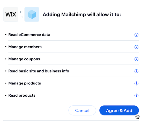 - Wenn du nicht in deinem Wix-Account angemeldet bist, wirst du dazu aufgefordert. Wenn du noch keinen Wix-Account hast, klicke auf Sign Up (Registrieren), um einen zu erstellen. Sobald du dich in deinem Wix-Account angemeldet hast, wird eine Nachricht angezeigt, in der die Account-Berechtigungen beschrieben werden, die du dieser Integration gewähren musst. Überprüfe diese Informationen und klicke dann auf Agree and Add (Zustimmen und Hinzufügen), um den Verknüpfungsprozess fortzusetzen.