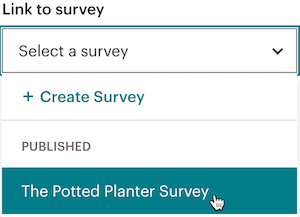 - Klicke im Menü Survey (Umfrage) auf das Dropdown-Menü Link to survey (Mit Umfrage verlinken) . Wähle dann die Umfrage, auf die du verlinken willst.