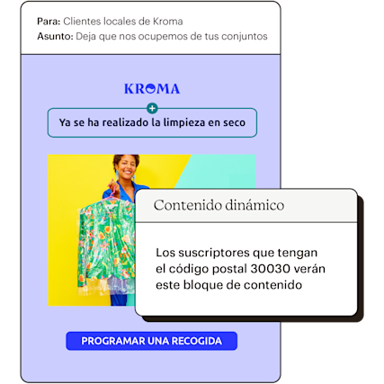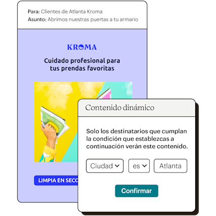 El contenido dinámico en el email marketing garantiza que se muestre el contenido adecuado a las personas correctas y que cada mensaje que envíes esté personalizado, incluso si lo envías de manera masiva. Como resultado, no tienes que crear un nuevo correo electrónico ni enviar un mensaje de seguimiento para el contenido que solo quieres que vean algunos contactos. Podemos ayudarte tanto si quieres ofrecer un código promocional a los clientes de determinadas localidades como si quieres mostrar nuevos productos a grupos de edad específicos.