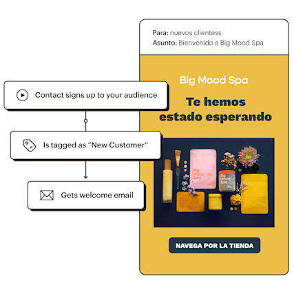 Ahora que sabes lo que le gusta a tu público, puedes enviar mensajes automátizados adaptados a sus comportamientos y preferencias. Nuestro creador de recorridos del cliente te permite crear visualmente rutas para enviar mensajes relevantes basados en etiquetas. Por ejemplo, puedes etiquetar a un nuevo cliente y comenzar un recorrido de bienvenida tan pronto como se aplique la etiqueta.