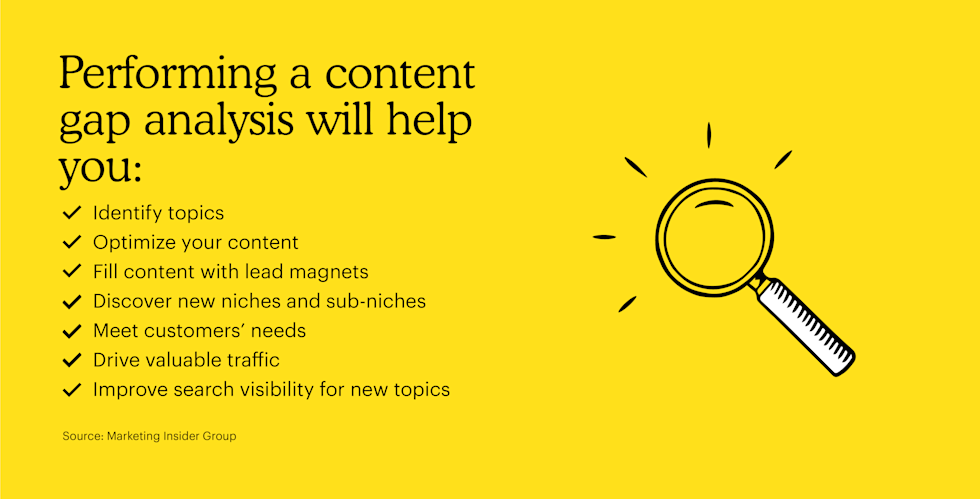 Pero, si no estás seguro de cómo crear este contenido, puedes realizar un análisis de brechas de contenido de SEO. Un análisis de brechas de contenido te ayudará a descubrir temas destacados y palabras clave específicas en las que tus clientes estén interesados para que siempre puedas crear el contenido adecuado para tu público objetivo.