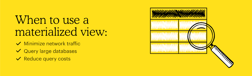 También puedes utilizar vistas materializadas para habilitar la creación de subconjuntos de datos, lo que puede ahorrar tiempo de consulta y costes de almacenamiento de datos. Con la creación de subconjuntos de datos, puedes copiar diferentes porciones de una base de datos que sean específicas de un departamento.
