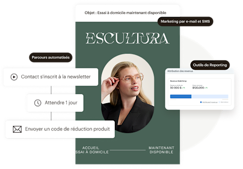 - 9 fois plus de chiffre d’affaires : basé sur le chiffre d’affaires total généré par les e-mails groupés des utilisateurs des flux d’automatisation marketing entre janvier 2023 et janvier 2025. Les fonctionnalités des flux d’automatisation marketing varient selon le type de plan.