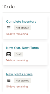 Use your Campaign Manager to do list to keep track of incomplete tasks and draft emails. Click the campaign you want to work with, click Manage campaign, then view your planned items in the To do section. Each campaign has its own list and displays the days remaining to complete your task or send your email, based on the date each item appears on the calendar.