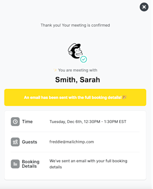 A calendar invite is sent to the email address used to create your Mailchimp account. It comes directly from your assigned onboarding specialist with “Mailchimp Onboarding” in the subject line. If you don’t see the calendar invite in your inbox within a few minutes, search your spam folder for your onboarding specialist’s name.