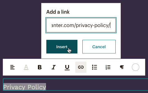 In the Add a link pop-up modal, type in the URL for your privacy policy and click Insert.