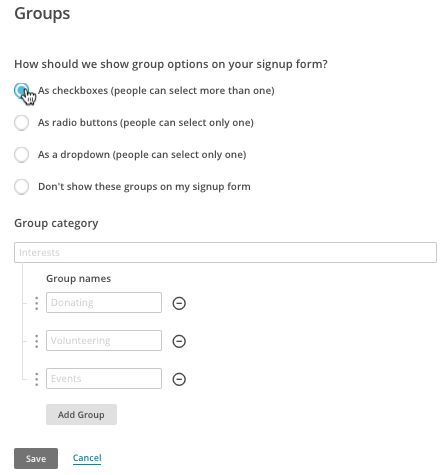 Groups let you ask subscribed contacts to categorize themselves based on common interests or preferences. You can use group data to help you send targeted campaigns.
