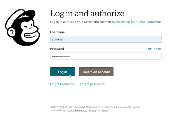 For this process, you'll add the Mailchimp extension to your Adobe Photoshop account and authorize the connection.