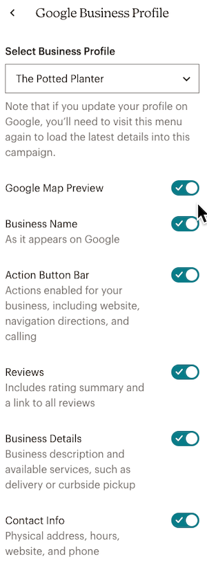 After your accounts are connected, you can choose which information in your Google Business profile you want to add to your email. You can customize the information you’re sharing for each email campaign you build.