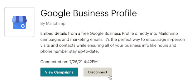 When you disconnect the Google Business Profile app from your Mailchimp account, any information you may have added to a campaign using the app remains until you remove the content block.