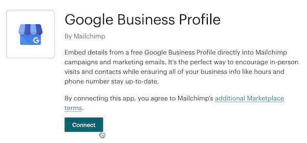 If you want to connect your Mailchimp account with your Google Business profile, use the Google Business Profile app. This lets you add information from your Google Business profile to email campaigns you create. For example, you can add your hours, a map to your business, or photos of your business from your Google Business profile directly to your email campaign without having to upload anything to your Mailchimp account.