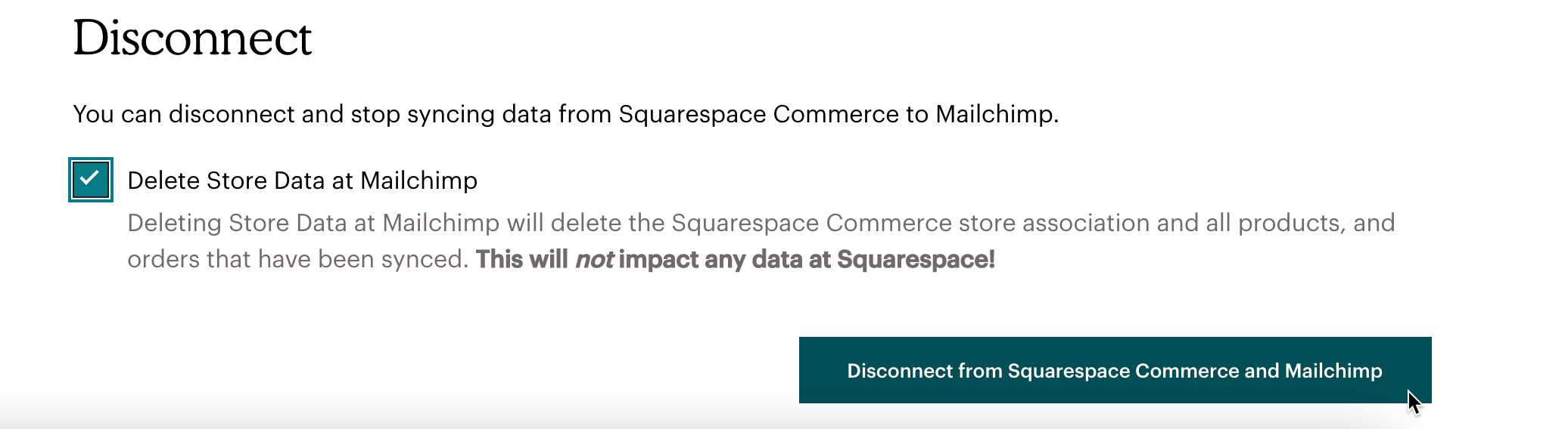 - Select Delete Store Data at Mailchimp, and then click Disconnect from Squarespace Commerce and Mailchimp.