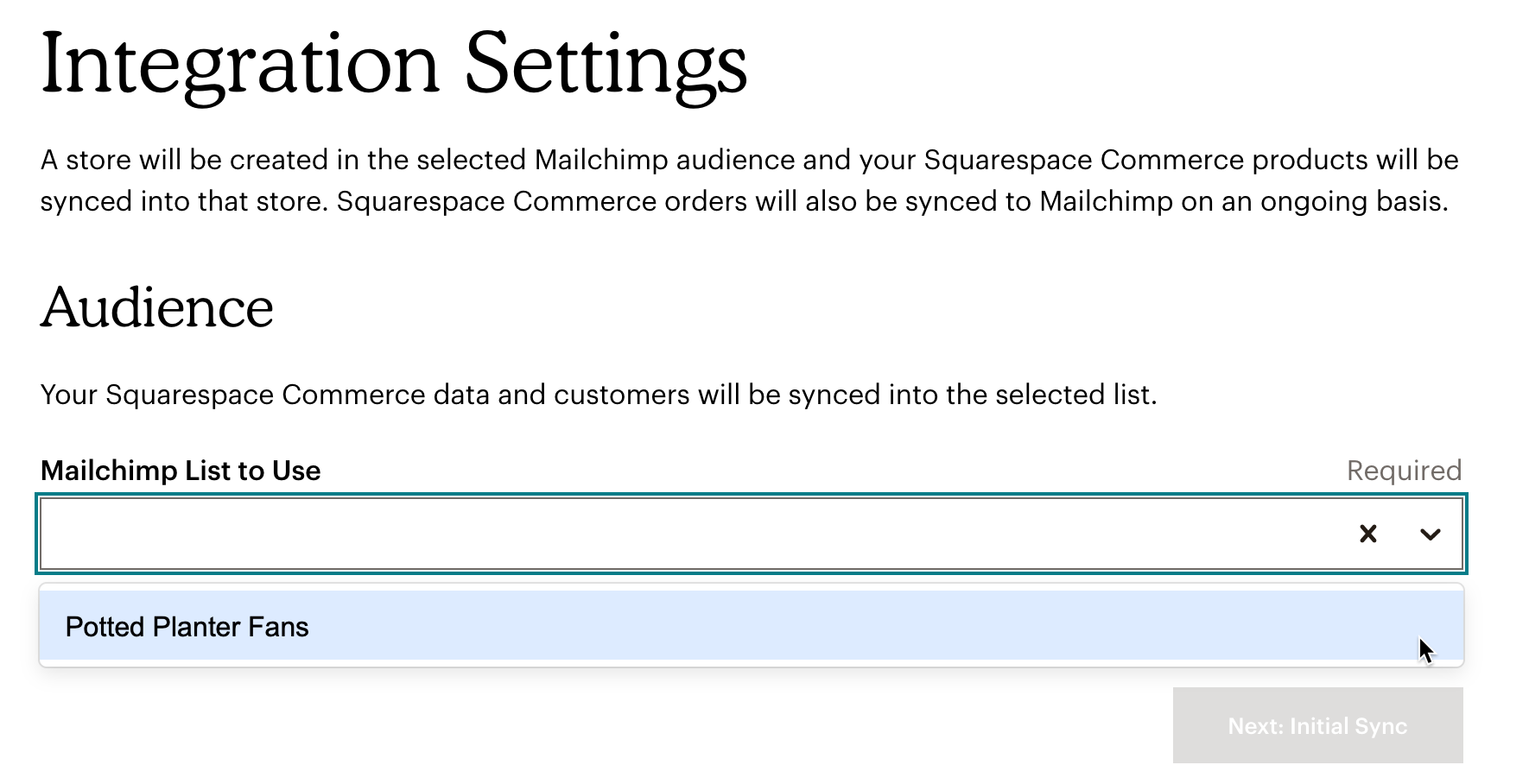 - On the Integration Settings page, select the Mailchimp audience you want to sync your Squarespace store information with and click Next: Initial Sync.