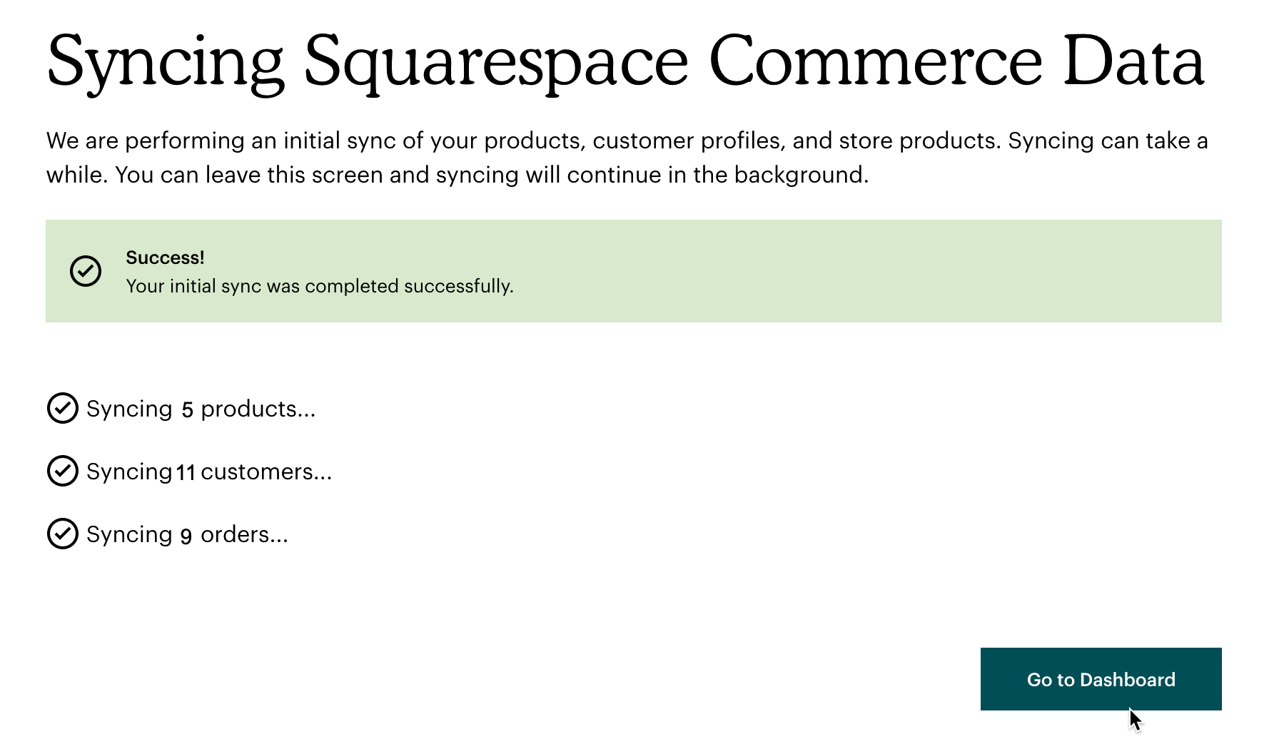 That’s it! Your Squarespace Commerce data is synced to your selected Mailchimp audience. Click Go to Dashboard to see details about your integration.