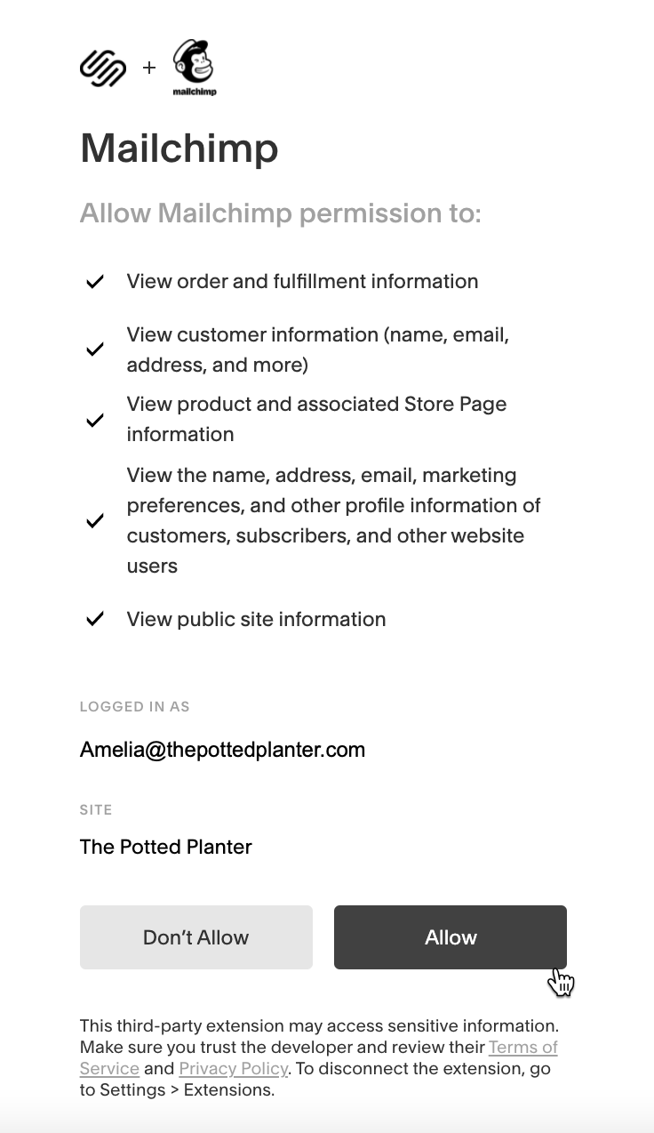 Connect or Disconnect Mailchimp for Squarespace Commerce
