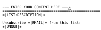 When you create a plain-text email in Mailchimp, we automatically include a default plain-text footer for you. Plain-text emails are subject to the same legal requirements as HTML emails, so we include our unsubscribe merge tag and the physical address associated with your audience. You can add or remove certain merge tags and other text, as long as you include the required footer content.