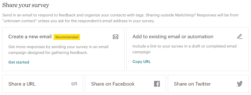 Creates a link to add in Mailchimp emails and automations. Responses are tracked if the respondent is already in your audience, or if you ask for the respondent's email. Recommended for one-off surveys or recurring surveys. - Share a URL