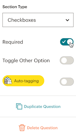 Auto-tagging applies tags to your contacts based on their responses. You must share your survey through a Mailchimp email or automation in order for tags to apply automatically to existing contacts. New contacts will be auto-tagged if they join your audience via the survey. Auto-tagging doesn't apply to surveys shared outside of an email or automation unless you add an Email question type to collect email addresses. Toggle the Auto-tagging slider on then click Manage Tagging to apply tags. - Repeat steps 1–4 for any other sections you want to add. Click Duplicate Question to make a copy, or click Delete Question to remove a question.