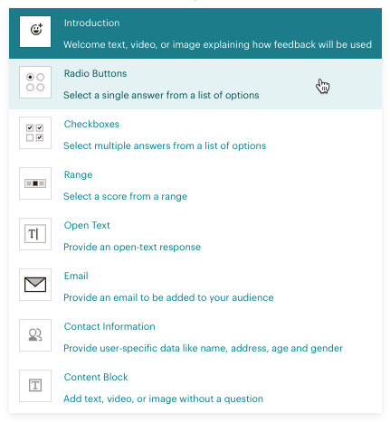 - Choose a section type based on whether you want respondents to use Radio Buttons, Checkboxes, a Range, or an Open Text box. You can also add an Introduction, ask for Email or Contact Information, or include Content Blocks.