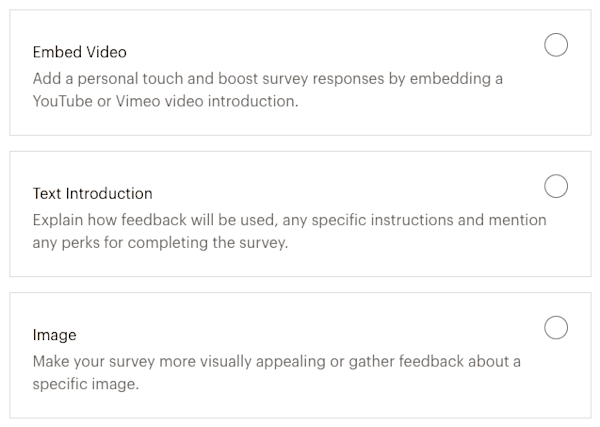 If you want to include an Introduction, use text, add an image, or embed a video from YouTube or Vimeo to welcome respondents to the survey.