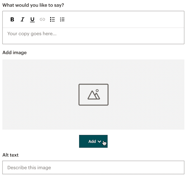 To add an image to an Introduction or Content Block, click the Add drop-down. Select Upload Image to add a new image, or select Browse Images to add an image from the Content Studio. You can also add text or alt text to support your image.