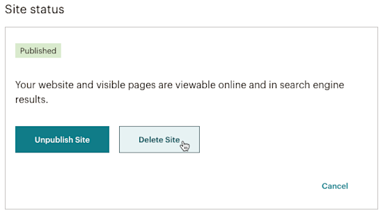 Your website will be permanently deleted. If someone tries to visit your deleted website, and you originally published your site on a purchased or connected domain, the visitor will see a Mailchimp-branded placeholder page.