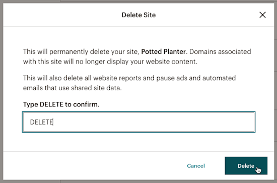 In the Delete Site pop-up modal, type DELETE, then click Delete.