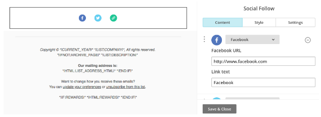 Most Mailchimp email templates have social follow icons to help your contacts follow you on sites like Facebook or X (formerly Twitter). We’ll link the icons to default sites until you fill out your own information.