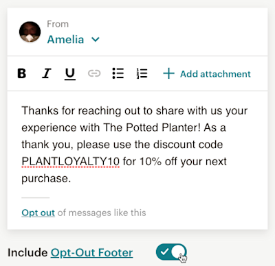To use it, click Reply on any email message from a contact in your Inbox, then toggle the Include Opt-Out Footer on.