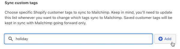 - Enter the Shopify customer tags you want to keep in sync with Mailchimp and click Add. Your tags will be displayed below the text box.