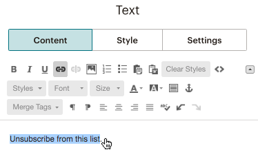 The Footer content block pulls in all content that is required under CAN-SPAM laws and our Terms of Use. Learn how to change the style and settings.