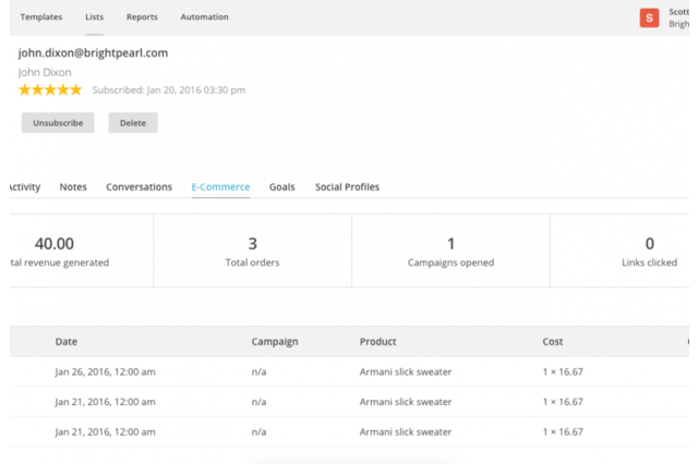 Brightpearl provides an omnichannel CRM that allows you to segment and identify customers for targeted marketing activities. Once identified, these customers and their purchasing history is automatically available in Mailchimp.