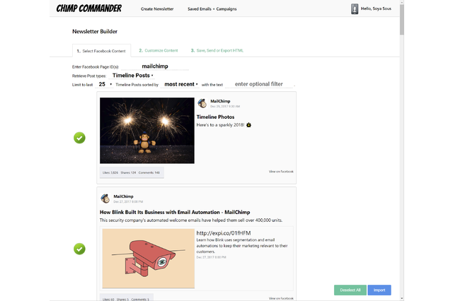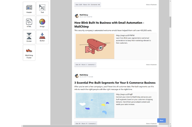 Social Content Blocks Chimp Commander's drag-and-drop builder uses social blocks to produce a beautiful, ready-to-go email newsletter. Start by entering a Facebook page ID and we'll automatically pull all the page's social content. Select the content you'd like to use, click Import and Chimp Commander will automatically create the newsletter for you. Save the campaign directly to your Mailchimp account, or even schedule it immediately right from Chimp Commander. You can also export the raw HTML if you want to use or modify it in other ways.