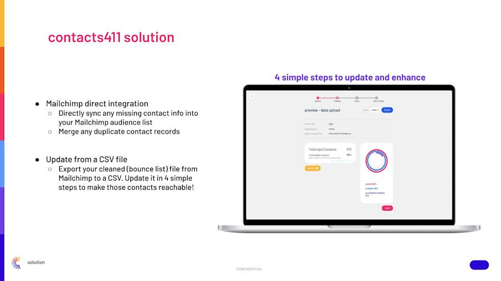 Contacts411 is the affordable and easy solution for small businesses and nonprofits to reduce their email bounce rates, update contact information, and connect with customers or donors. Say goodbye to outdated information with our powerful tool that syncs directly into your Mailchimp audience. With just four simple steps, you can export your cleaned file and get fresh contact info (email, phone, address) for those unreachable contacts.