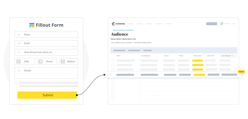 The Fillout-Mailchimp integration is an easy way to upgrade your email marketing efforts. Save time, improve audience engagement, and view advanced analytics to make smarter marketing decisions.