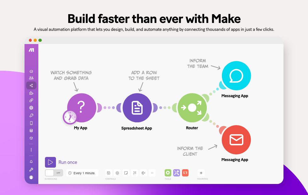 Make is a visual platform that lets you design, build, and automate anything – from simple tasks to complex workflows – in minutes. It’s fast and easy to use, visually intuitive, and it requires zero coding expertise.
