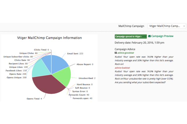 - Complete view of Mailchimp List & Campaign report graph, advice, preview, etc,., inside Vtiger CRM can help you to compare and take smart decisions.