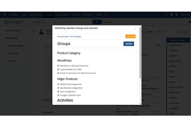 Vtiger Mailchimp Integration is an extension to connect your Vtiger CRM with Mailchimp. You can sync Mailchimp Campaigns, Lists, Groups and Groupings to Vtiger CRM Campaigns, Leads, Contacts and Accounts module.