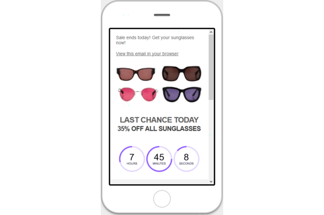 Delivered as an animated GIF, the timer renders the actual time remaining on your countdown at the moment the user opens their email (not when you sent it). Timers can be customized for colors, style, and font.
