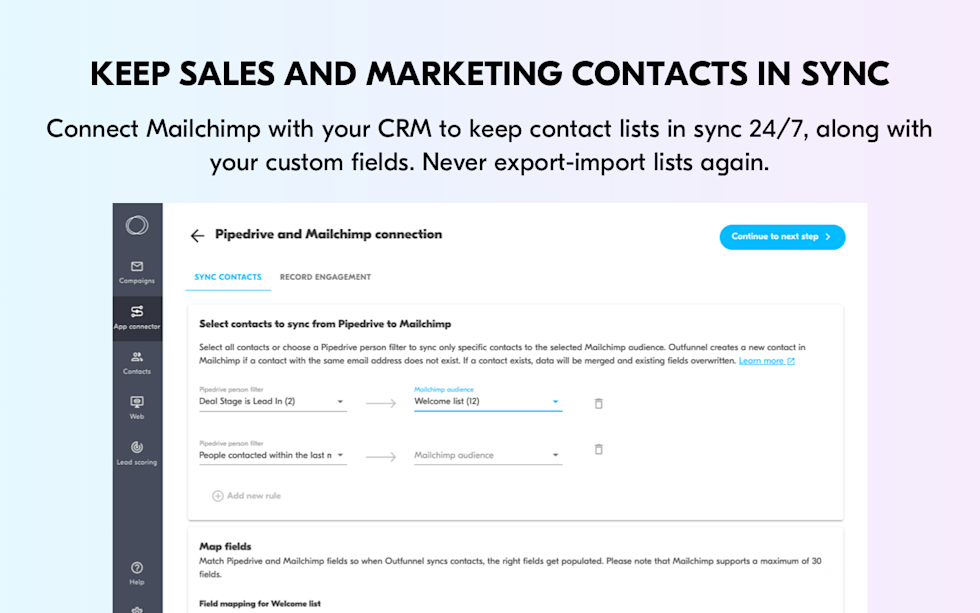 Generic data integration tools and native solutions often fail to sync your CRM and Mailchimp fully. That's where Outfunnel shines.