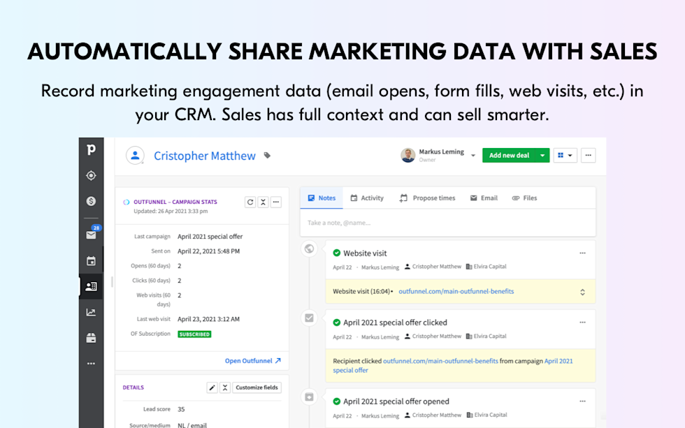 Outfunnel supports top CRMs like Pipedrive, HubSpot, Salesforce, and Copper.