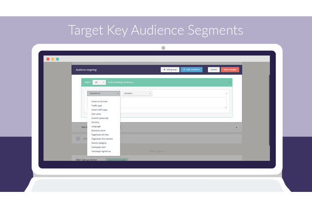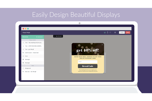 Entice people to sign up for your list with downloadable content and special discounts Use advanced targeting and trigger rules to display campaigns based on exit intent, cart abandonment, cart value, scroll, timer, geography, device type, page, number of visits, referral site, language and more Let your creative juices flow with dozens of customizable designs for all of your pop ups, spin to win wheels, banners, flyouts, scroll boxes, announcement bars, and embedded forms Use no-form campaigns to promote products and special offers for existing subscribers Create, distribute, and track single use, and bulk coupon codes for Shopify, Shopify Plus, and BigCommerce that are shown in your displays and sync automatically to your store Run Automated A/B split tests to understand how small changes impact conversion rates