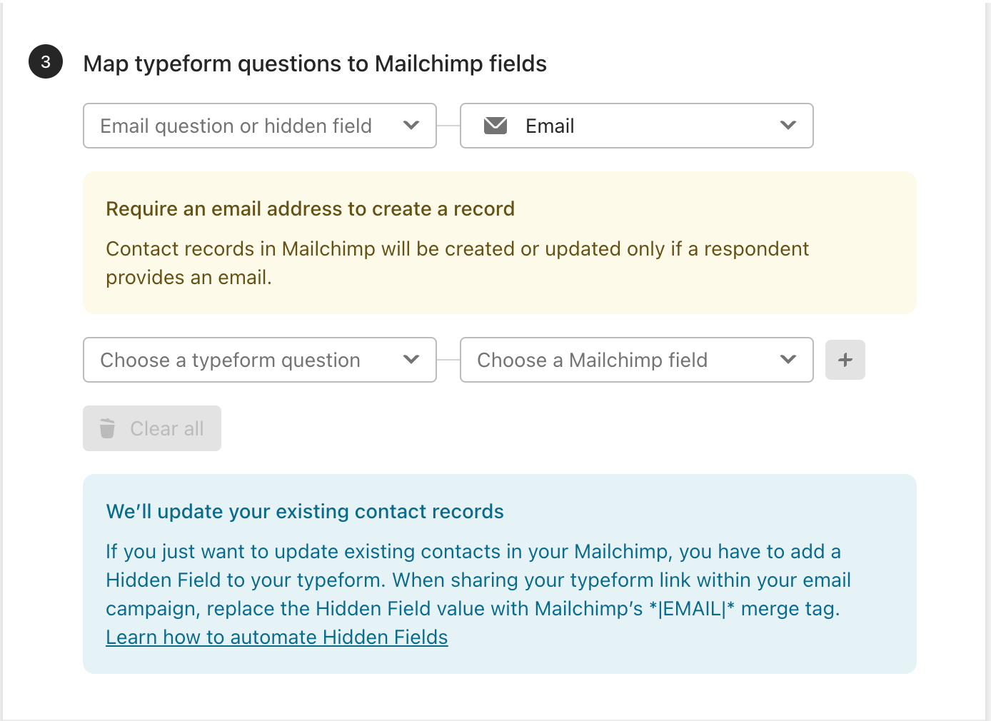 Send typeform responses to Mailchimp—the all-in-one email marketing and automation platform. Find your audience, engage your customers, and build your brand. And have a bit of fun while you're at it. Easily edit your configurations at any time, whether you need to change up your mapping or if you created a new list.