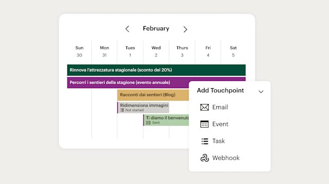 I webhook ti consentono di pianificare o automatizzare azioni utilizzando i tuoi strumenti preferiti, in modo da poter coordinare le interazioni con i clienti, il lancio delle campagne, gli aggiornamenti interni al team e altro ancora, il tutto direttamente da Mailchimp.