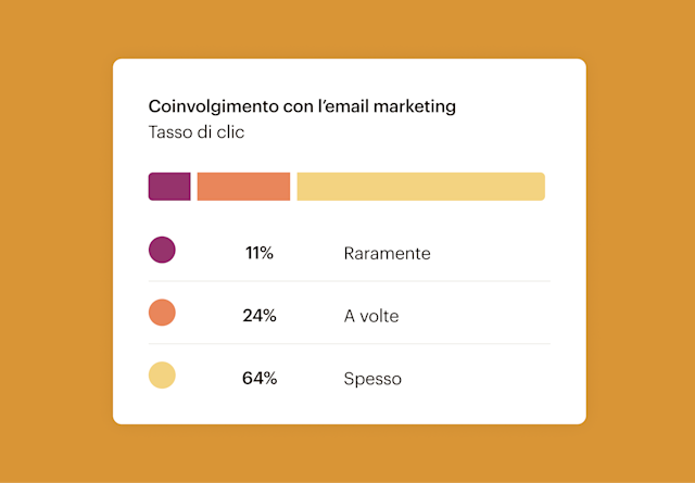 Con Mailchimp, avere informazioni sul tuo pubblico è semplicissimo, sia a livello globale che individuale. I nostri report su crescita, coinvolgimento ed entrate ti aiuteranno a scoprire gli schemi comportamentali del tuo pubblico e capire cosa può funzionare per le tue attività di marketing. I profili dei contatti ti permettono di scoprire le persone al di là dei numeri, per comprendere quali azioni abbiano condotto all’acquisto, annotare le preferenze individuali e tanto altro.