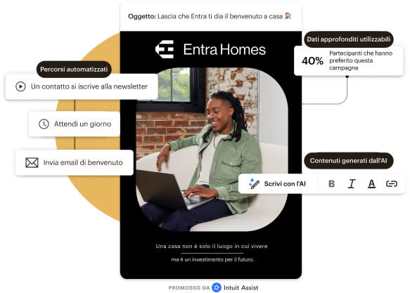 - Intuit Assist: la funzionalità Intuit Assist (beta) è disponibile solo in lingua inglese in determinati Paesi per alcuni utenti con i piani Premium, Standard e piani mensili preesistenti. Attualmente l'accesso a Intuit Assist è disponibile senza costi aggiuntivi. Prezzi, termini, condizioni, funzionalità speciali e opzioni di servizio sono soggetti a modifiche senza preavviso. Disponibilità e funzionalità variano in base al tipo di piano. Le funzionalità potrebbero essere presto disponibili, ma non costituiscono alcun obbligo e non dovrebbero essere tenute in considerazione per prendere decisioni di acquisto. Per maggiori dettagli, consulta i piani e i prezzi di Mailchimp.