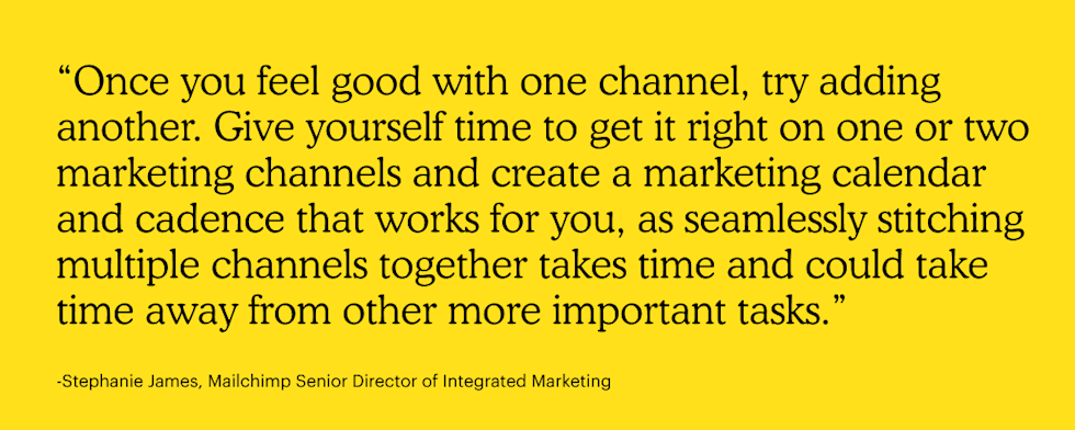 “Quando inizierai a sentirti a tuo agio con un canale, prova ad aggiungerne un altro”, afferma Stephanie James, Senior Director of Integrated Marketing di Mailchimp. “Concediti il tempo per farlo bene, concentrandoti su uno o due canali di marketing, e crea un calendario di marketing e una cadenza che funzionino per te, perché unire più canali richiede tempo e potrebbe sottrarne ad altre attività più importanti”.