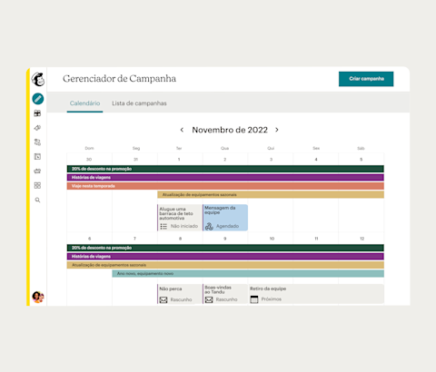 O Gerenciador de campanhas do Mailchimp permite que você crie campanhas em vários canais e gerencie todas elas a partir de uma plataforma unificada.