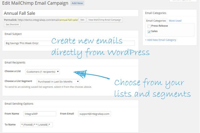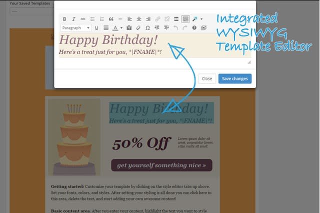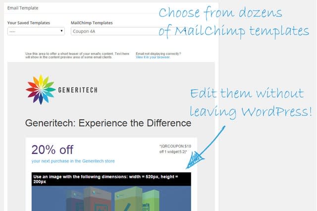 — Projete e envie campanhas diretamente do WordPress. O plug-in Integral Email traz todas as ferramentas do editor de e-mail do Mailchimp para o painel de controle do WordPress. Escolha entre dezenas de modelos de e-mail de alta qualidade do Mailchimp; adicione suas próprias imagens e texto através do nosso editor visual (semelhante ao designer do Mailchimp); envie pré-visualizações para endereços ou listas específicas; e salve e envie e-mails, tudo de seu próprio site WordPress.